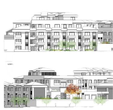 El lenguaje formal se apoya en una sucesión de planos horizontales marcados, terrazas y cuerpos retranqueados que aportan profundidad y dinamismo al alzado. La distribución de huecos mantiene una lectura ordenada y proporcionada, reforzando la sensación de ritmo y coherencia en toda la fachada.