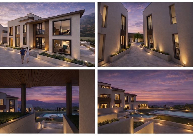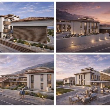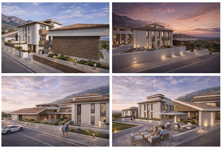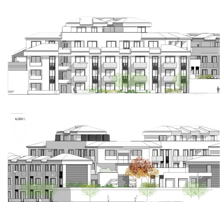 La fachada del conjunto se plantea con una composición sobria, equilibrada y contemporánea, combinando volúmenes escalonados que se adaptan a la topografía y reducen visualmente la escala edificatoria. La arquitectura busca una imagen elegante y serena, con una implantación que favorece la integración del edificio en el paisaje.