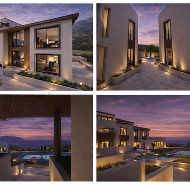 La propuesta combina paramentos claros con elementos de contraste en carpinterías, barandillas y algunos paños verticales, aportando definición y sofisticación al conjunto. La vegetación integrada en la base y en los espacios intermedios suaviza la presencia del edificio y refuerza su relación con el entorno natural.