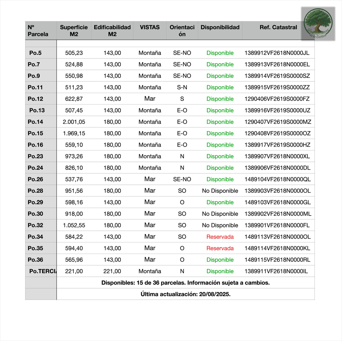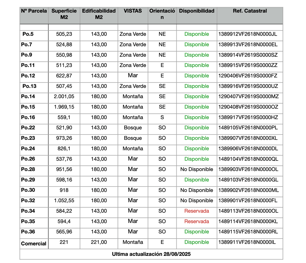 Cada ficha indica vistas (mar/sierra/mixta), orientación, pendiente y superficie. Podemos acompañarte con visita on-sitey simulaciones para valorar implantación y volumetría.