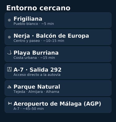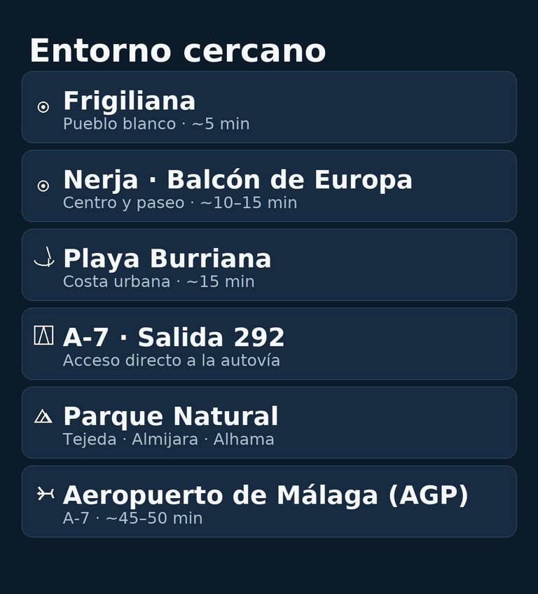 Terrazas de la Exótica se ubica entre Frigiliana y Nerja, con acceso directo por la A-7 (salida 292). En minutos pasas de las calles encaladas y el ambiente local a las playas y paseos del Balcón de Europa, con la sierra de Tejeda-Almijara-Alhama como telón de fondo. Vida tranquila, servicios cercanos y naturaleza mediterránea a tu medida.