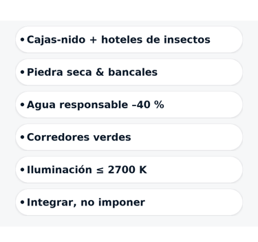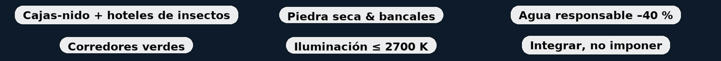 Biodiversidad útil: setos melíferos (lavandas, jaras), cajas-nido para aves insectívoras y “hoteles” de insectos.