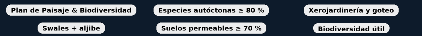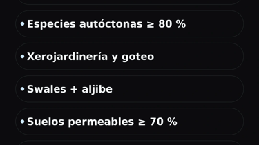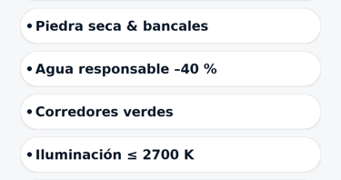 Agua responsable: xerojardinería, riego por goteo sectorizado, lago/aljibe paisajístico, swales y cunetas verdes para infiltrar escorrentías. Reutilizar lluvia (objetivo –40 % consumo vs. césped convencional).