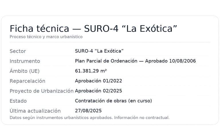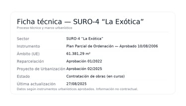 El sector de suelo urbanizable SURO-4 “La Exótica” se rige por el Plan Parcial de Ordenación aprobado el 10/08/2006. La actuación comprende una unidad de ejecución con superficie de 61.381,29 m², que ordena usos residenciales y dotacionales, zonas verdes y la red viaria interna, conforme a la normativa urbanística aplicable.
