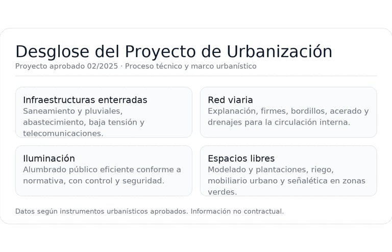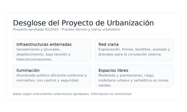 El proyecto aprobado en febrero de 2025 define las obras para materializar las obras del sector define: redes de saneamiento y pluviales, abastecimiento de agua, energía y telecomunicaciones; alumbrado público eficiente; viales, firmes y acerado; y tratamiento paisajístico de zonas verdes, con señalización y mobiliario urbano.