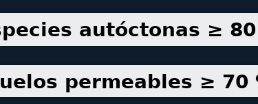 Superficie permeable ≥ 70 % en zonas verdes y recorridos; pavimentos drenantes en sendas.